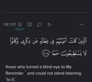 Share Facebook Twitter WhatsApp Copy Link Those who turned a blind eye to My Reminder and could not stand listening ˹to it˺. { Qur’an 18:101 }